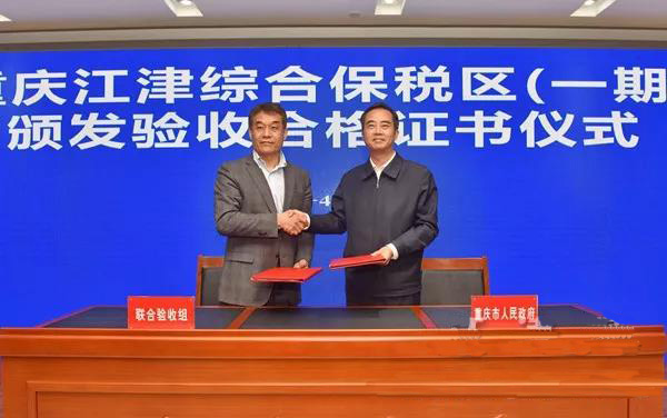經過認真評審后,聯合驗收組認為:重慶江津綜合保稅區(qū)(一期)已圍網的1.28平方公里范圍內的基礎和監(jiān)管設施符合《海關特殊監(jiān)管區(qū)域基礎和監(jiān)管設施驗收標準》和國家有關法律法規(guī)的規(guī)定和要求,已具備封關運行條件,同意通過驗收。聯合驗收組與重慶市人民政府簽署了《重慶江津綜合保稅區(qū)(一期)驗收紀要》,并為江津綜保區(qū)頒發(fā)了(一期)驗收合格證書。